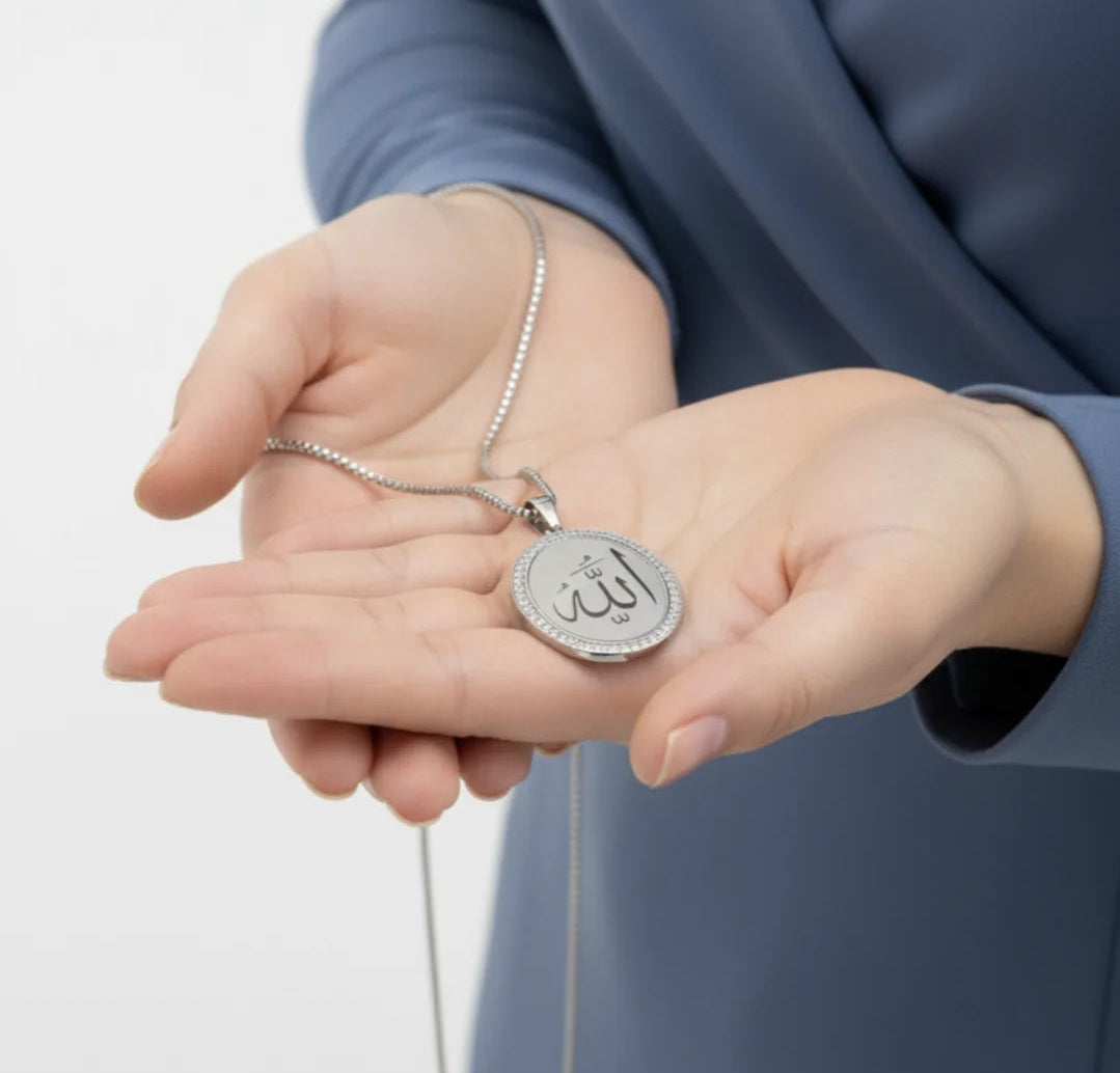 A timeless symbol of faith and devotion, this exquisite necklace is a piece of art to be worn close to the heart. The magnificent circular pendant features the sacred name of Allah (الله) beautifully rendered in classic, deep Arabic calligraphy.